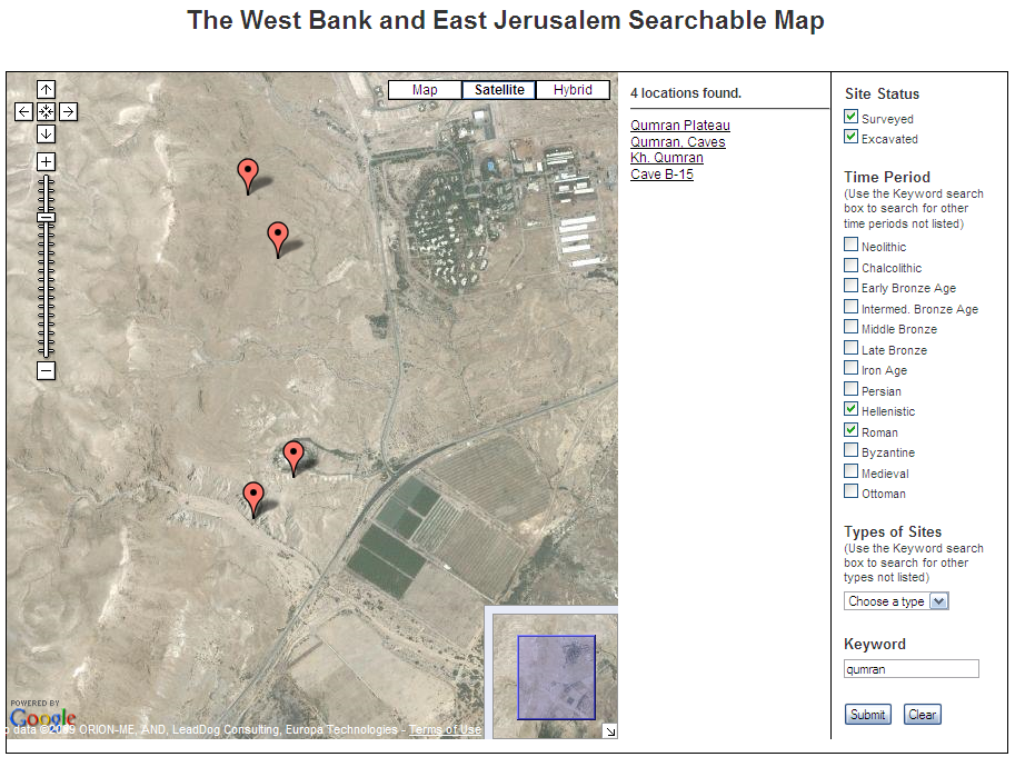 A team of archaeologists from UCLA, USC, Israel and Palestinian territories has developed the first map detailing Israeli archaeological activity in the West Bank and Jerusalem – much of it never publicly disclosed.Use THIS LINK to get to the page with further description and the links to the two versions of the map you can access, both of which use Google Maps. The first is a searchable map as shown above. You can search by period, type of site, or keyword. The other map, shown below, uses KML and opens directly in Google Maps.